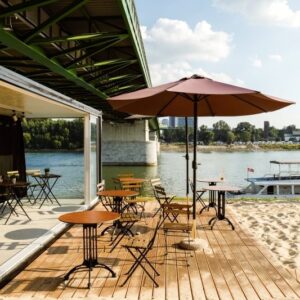 Relax on a sandy beach by the Danube with a drink and enjoy a summer sunset.